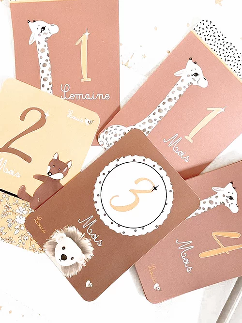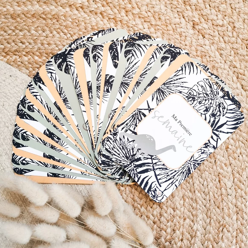 • 15 cartes pour les “mois-anniversaires” de votre bébé (de 1 semaine à 1 an) avec verso souvenirs à noter pour ne rien oublier !