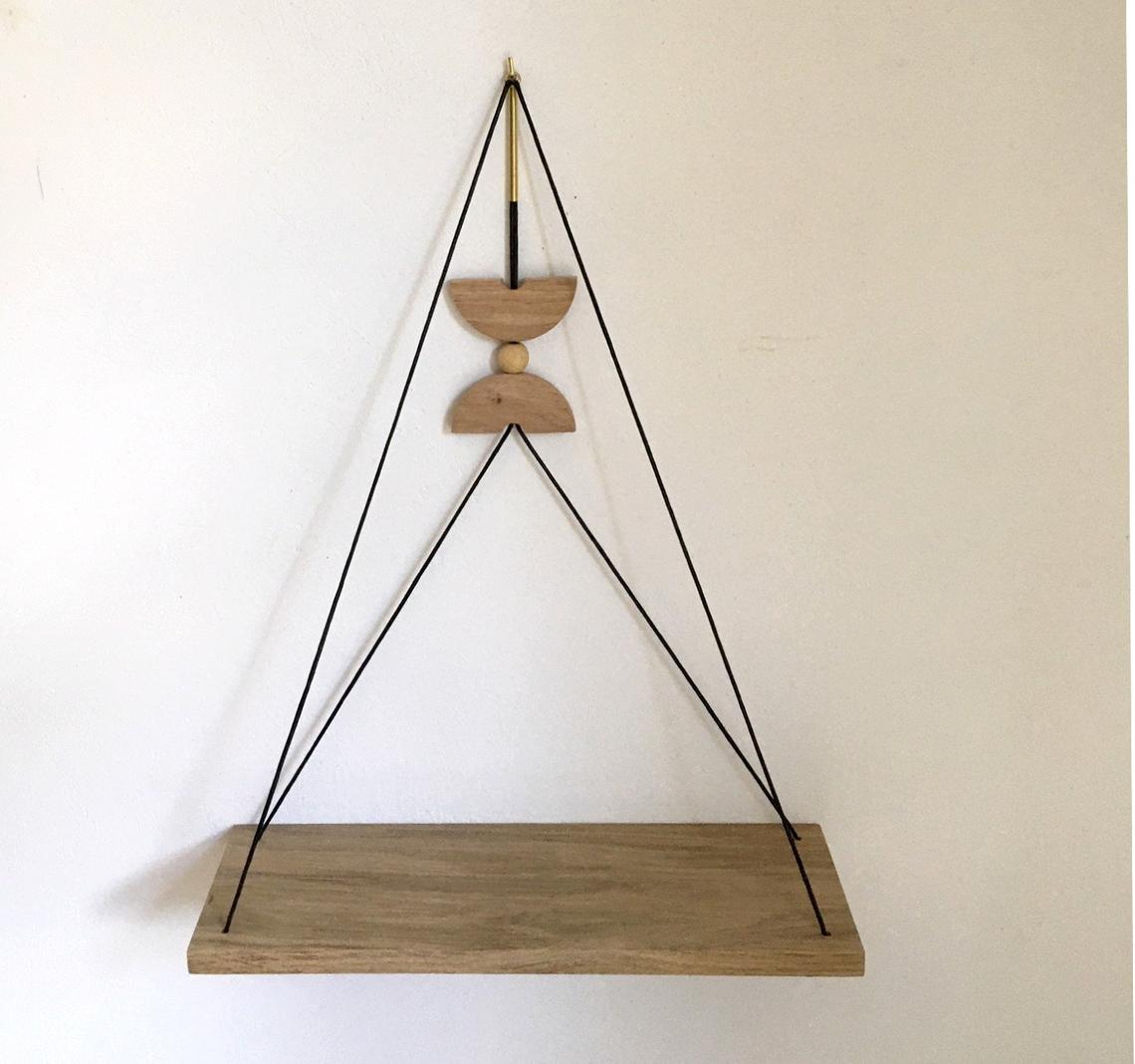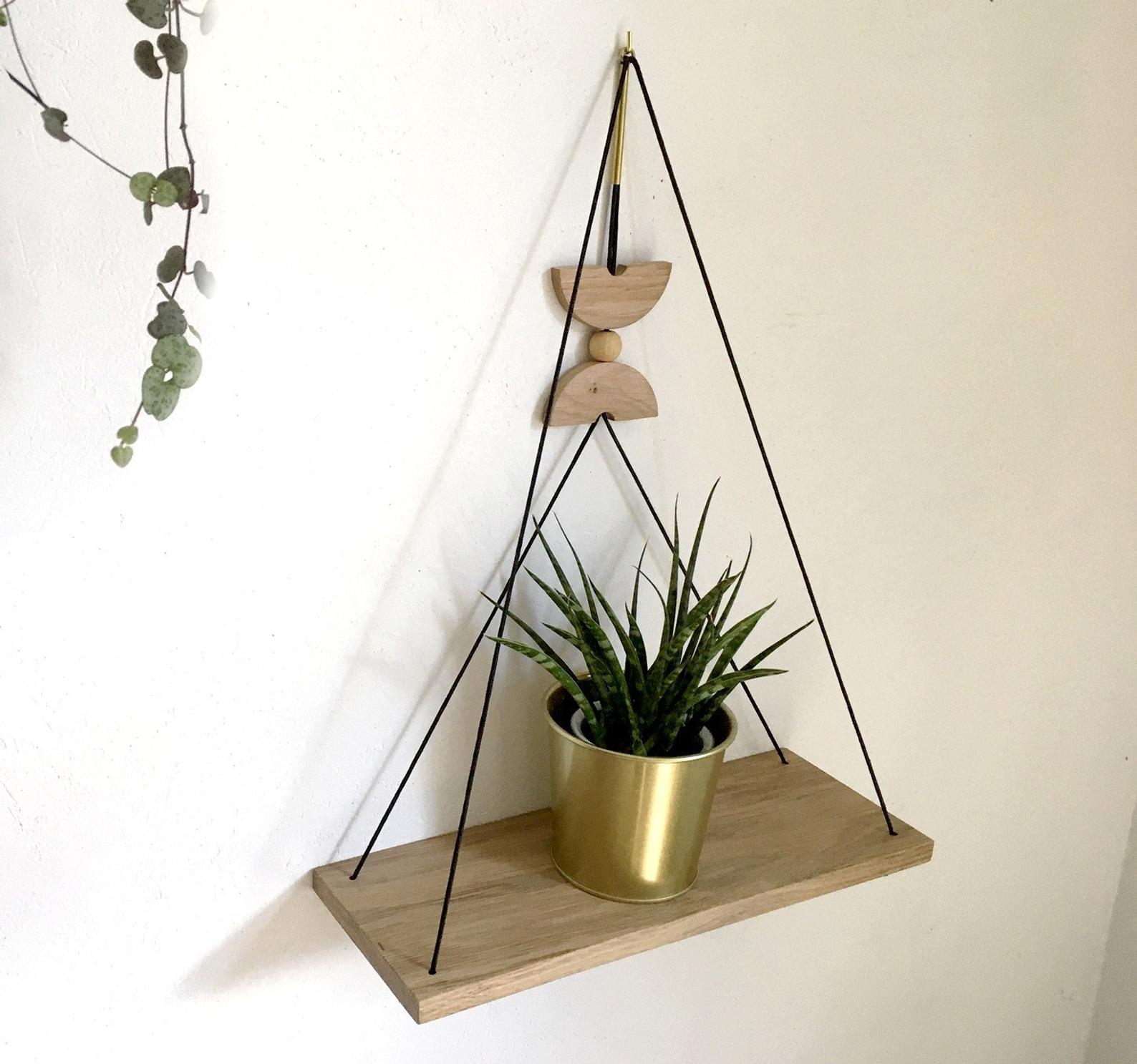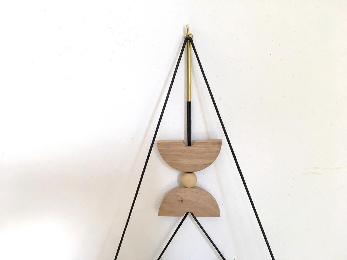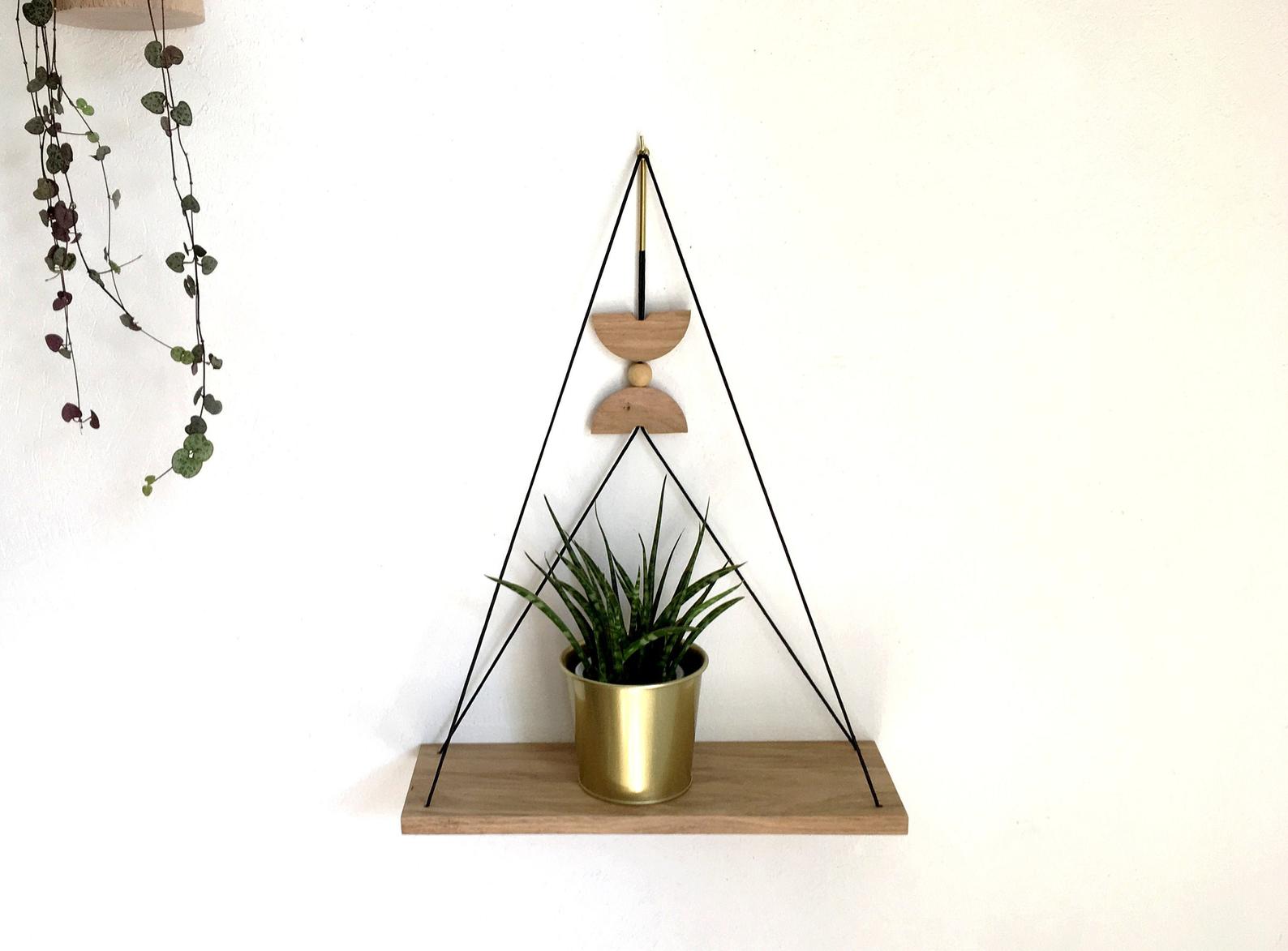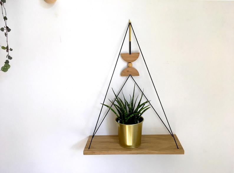 Géométrique avec un motif central en laiton et chêne qui peut coulisser pour être positionné plus ou moins haut selon votre goût, elle permet de ranger de façon décorative et originale vos bibelots ou petites plantes.