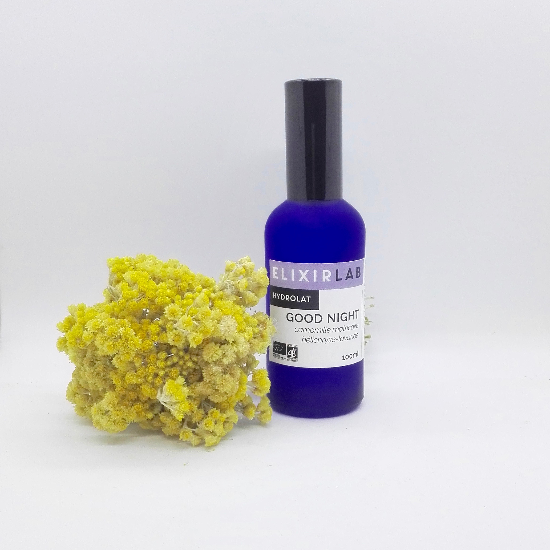 Hydrolat Good Night : eau florale qui relaxe et apaise votre peau. Sa composition florale appelle à la détente et au relâchement. Utilisé en fin de journée sur le visage et le cou, il nettoie la peau de ses impuretés et favorise le décongestionnement des tissus. Son application invite au lâcher-prise et permet de laisser aller les désagréments du quotidien.